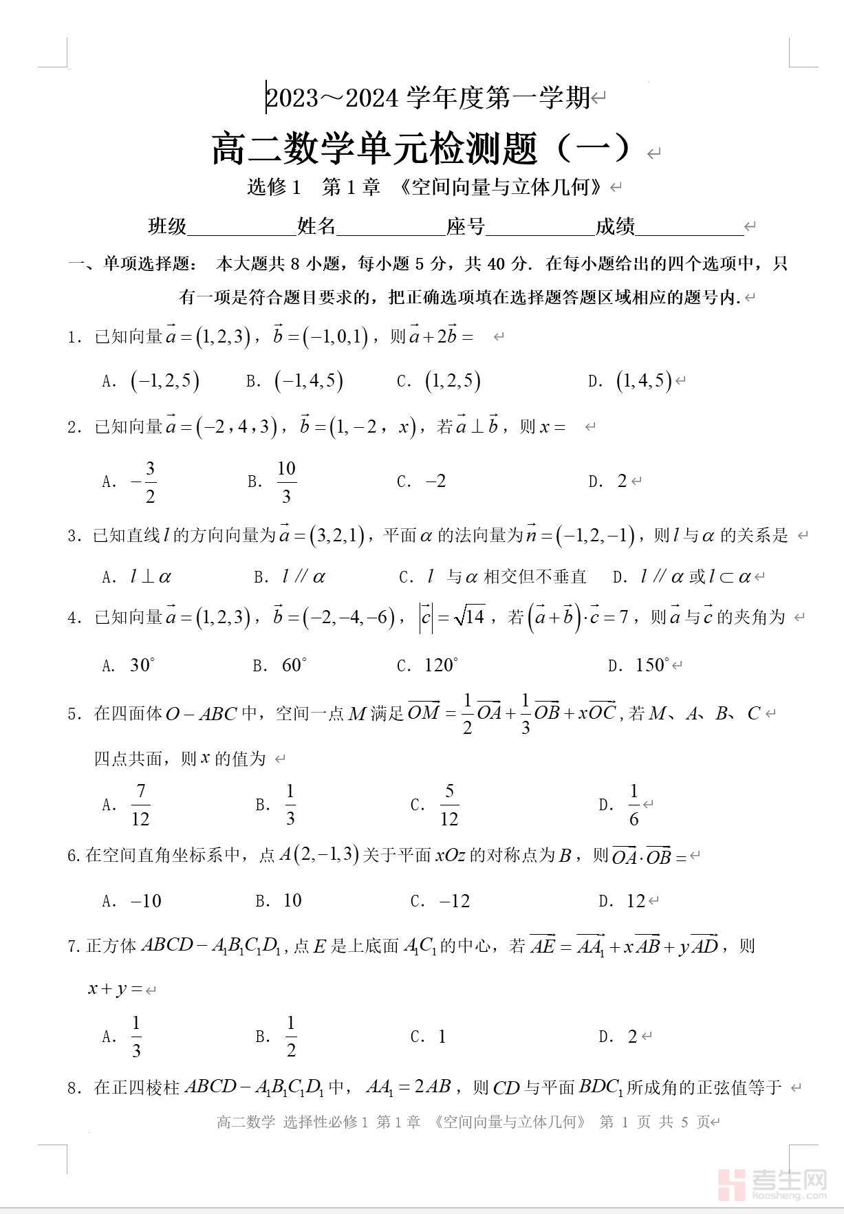第一章 空间向量与立体几何 单元检测-2023-2024学年高二上学期数学人教A版